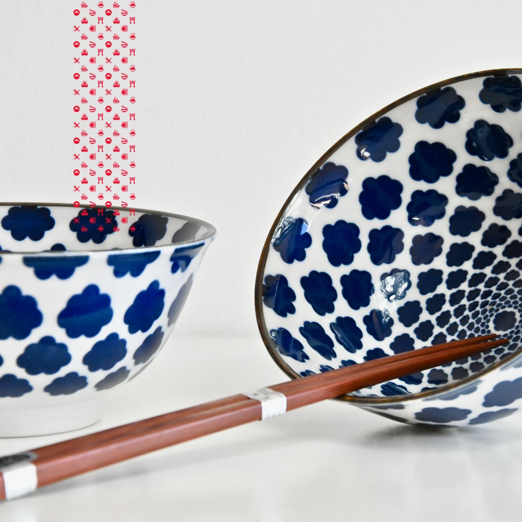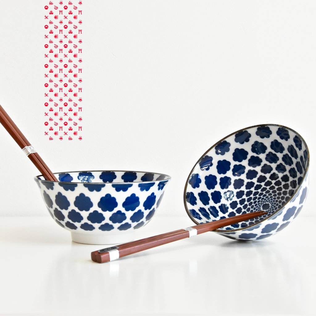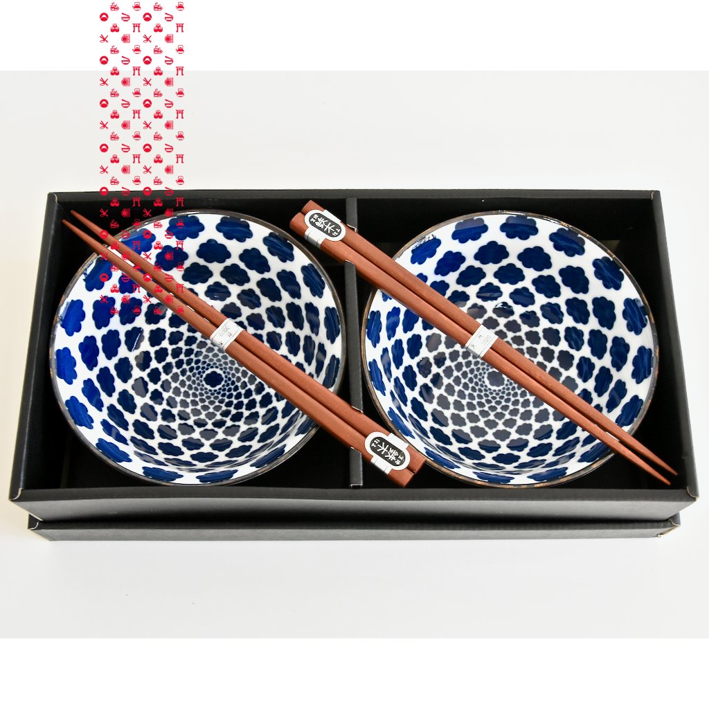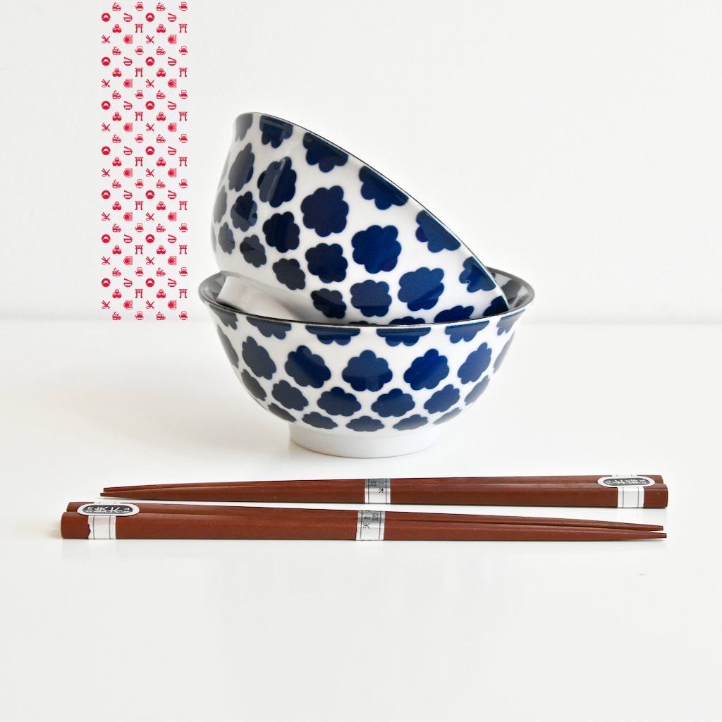 Set misek s dizajnem oblaků obsahuje 2 páry dřevěných jídelních hůlek a 2 misky o objemu 500 ml v modrobílých barvách, které jsou vyrobeny ručně z kvalitní přírodní keramiky. Set je vhodný do myčky na nádobí i do mikrovlnné trouby.