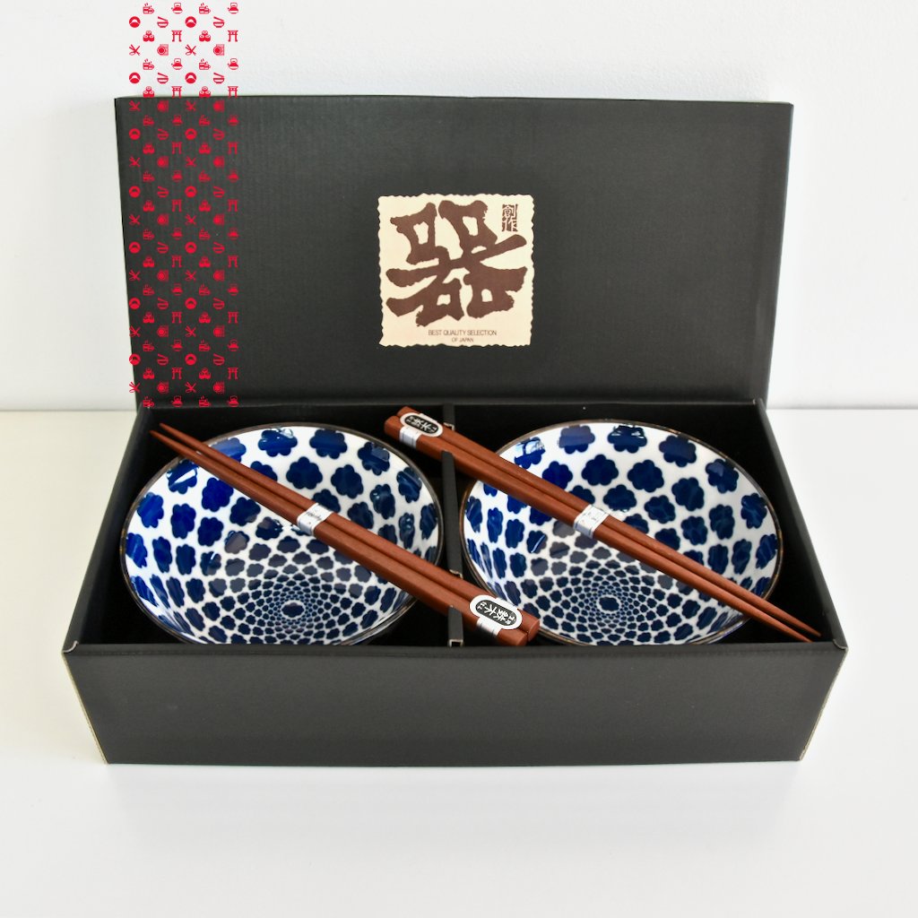 Set obsahuje 2 páry dřevěných jídelních hůlek a 2 misky se vzorem modrých vážek na bílém podkladě. Okraj misek je ohraničený stříbrnou barvou. Tato sada je dodávána v elegantní černé dárkové krabičce, a je tedy vhodná jako dárek pro přátele nebo obchodní partnery.