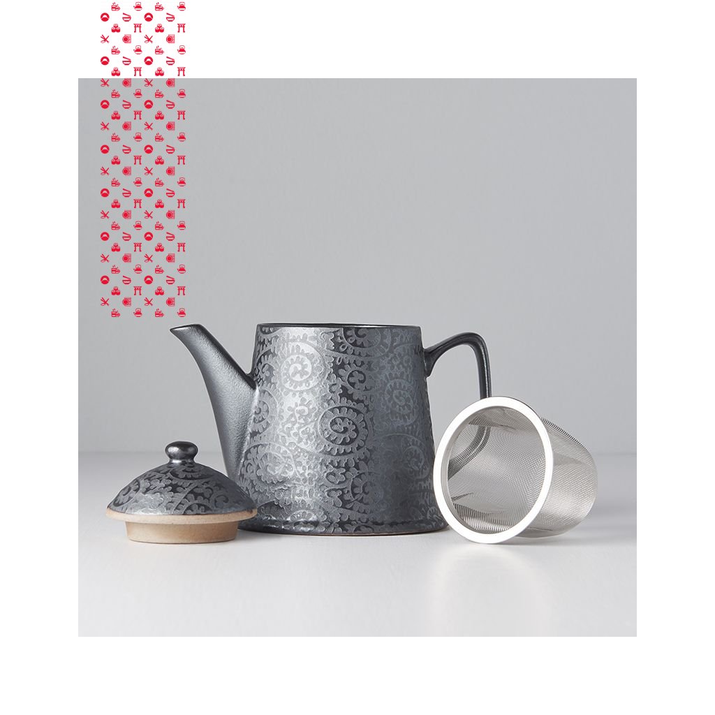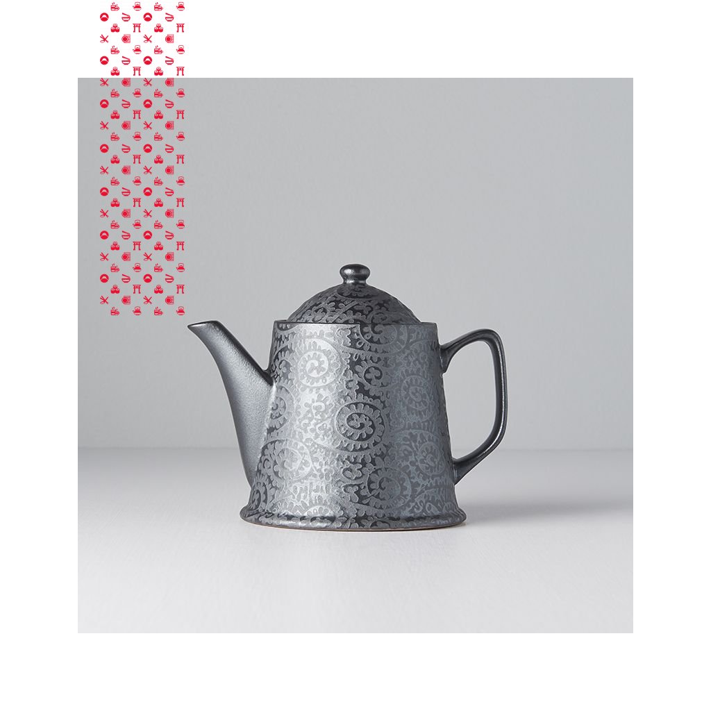Konvice na čaj má šedý matný podklad s lesklými spirálami v tmavě šedé barvě. Evokuje pocit, že je vytvořená z kovu. Součástí je nerezové sítko na sypaný čaj a poklička na udržení čaje déle teplého.