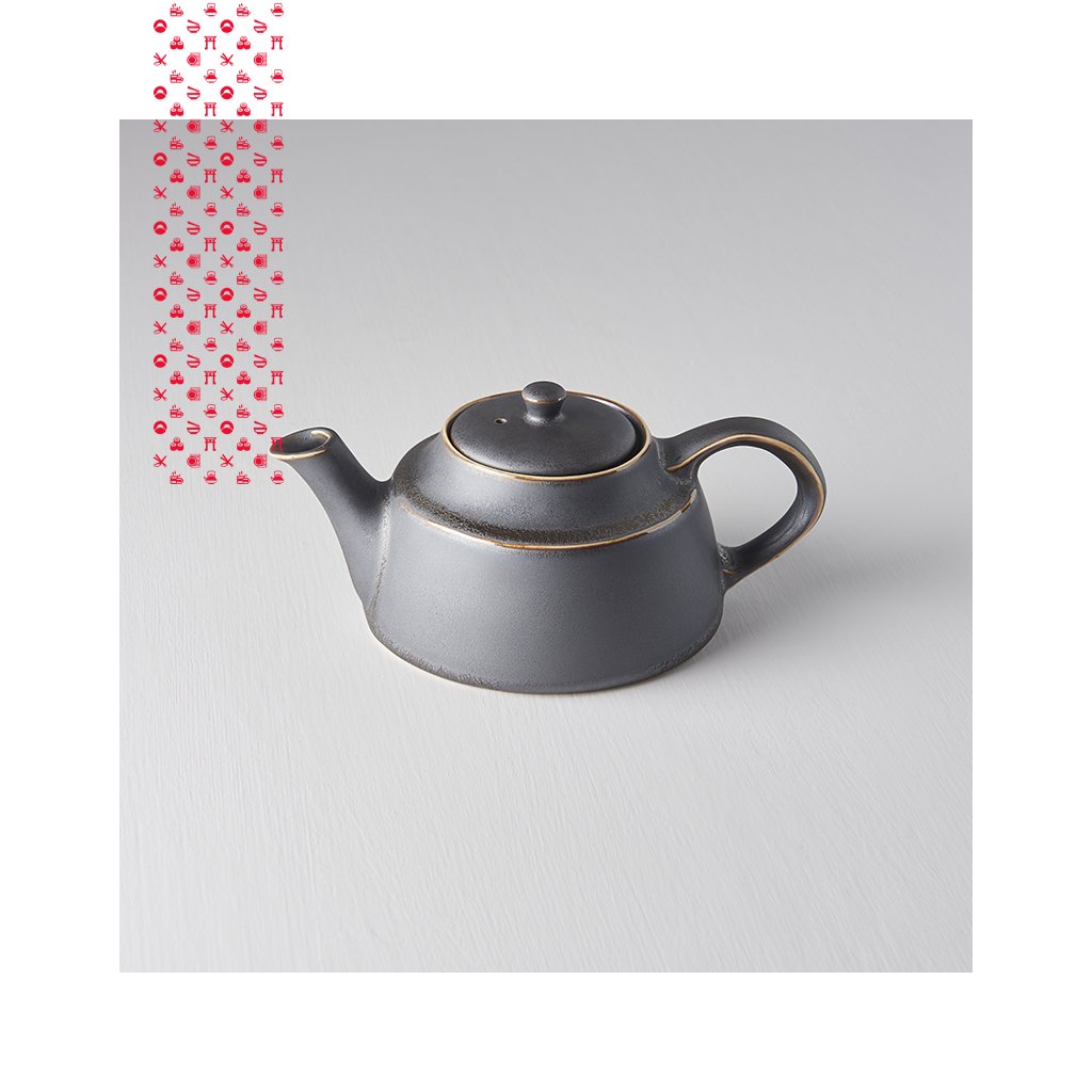 Konvice na čaj má šedé, metalické provedení se zlatými linkami. Evokuje pocit, že je vytvořená z kovu. Součástí je nerezové sítko na sypaný čaj a poklička na udržení čaje déle teplého.