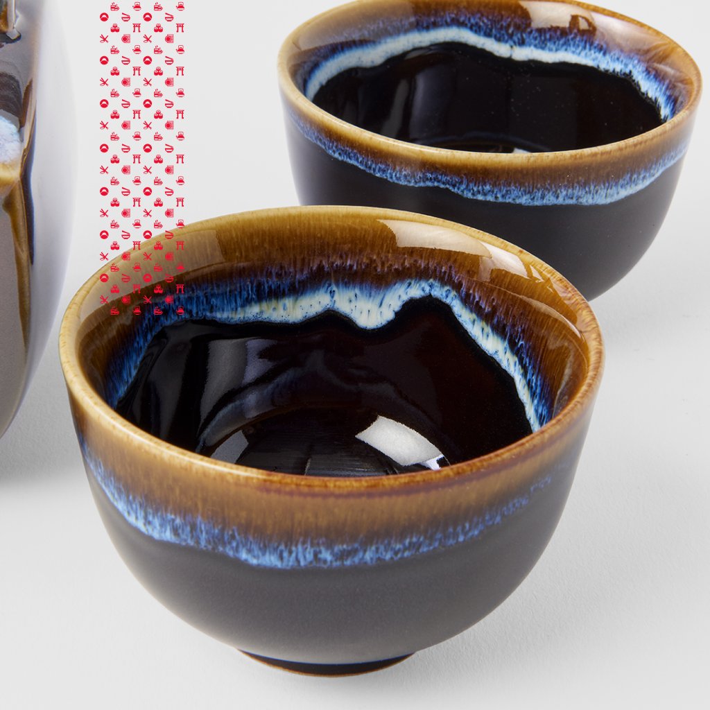 🍵 Čajový set Tenmokku s jasně modrou glazurou je mistrovským dílem tradiční japonské keramiky. Set obsahuje konvici, 4 šálky a sítko – vše ručně vyrobeno z odolné keramiky, která neobsahuje škodlivé látky ani těžké kovy. Vyrobeno japonskými řemeslníky, jejichž tradice sahá až do 12. století.