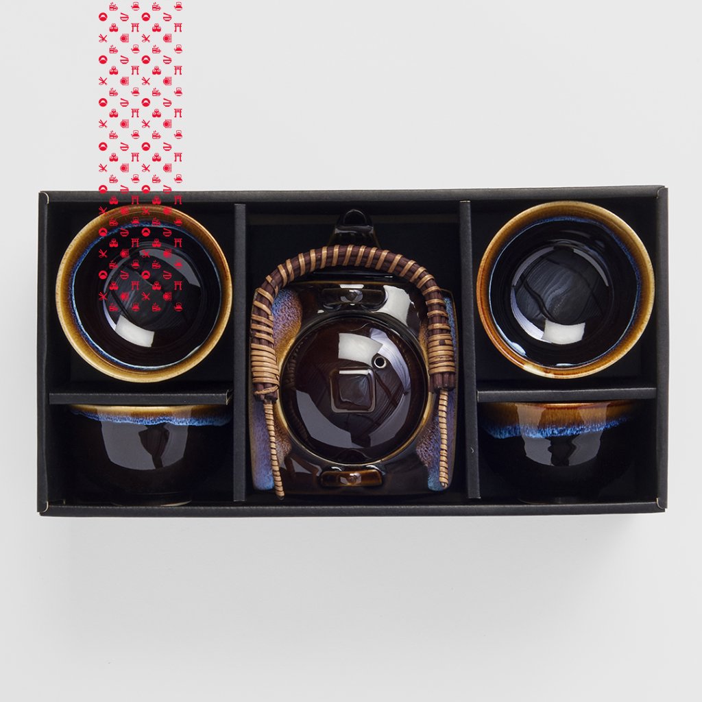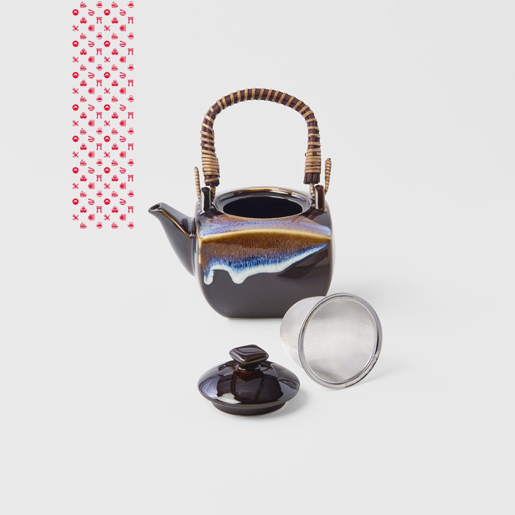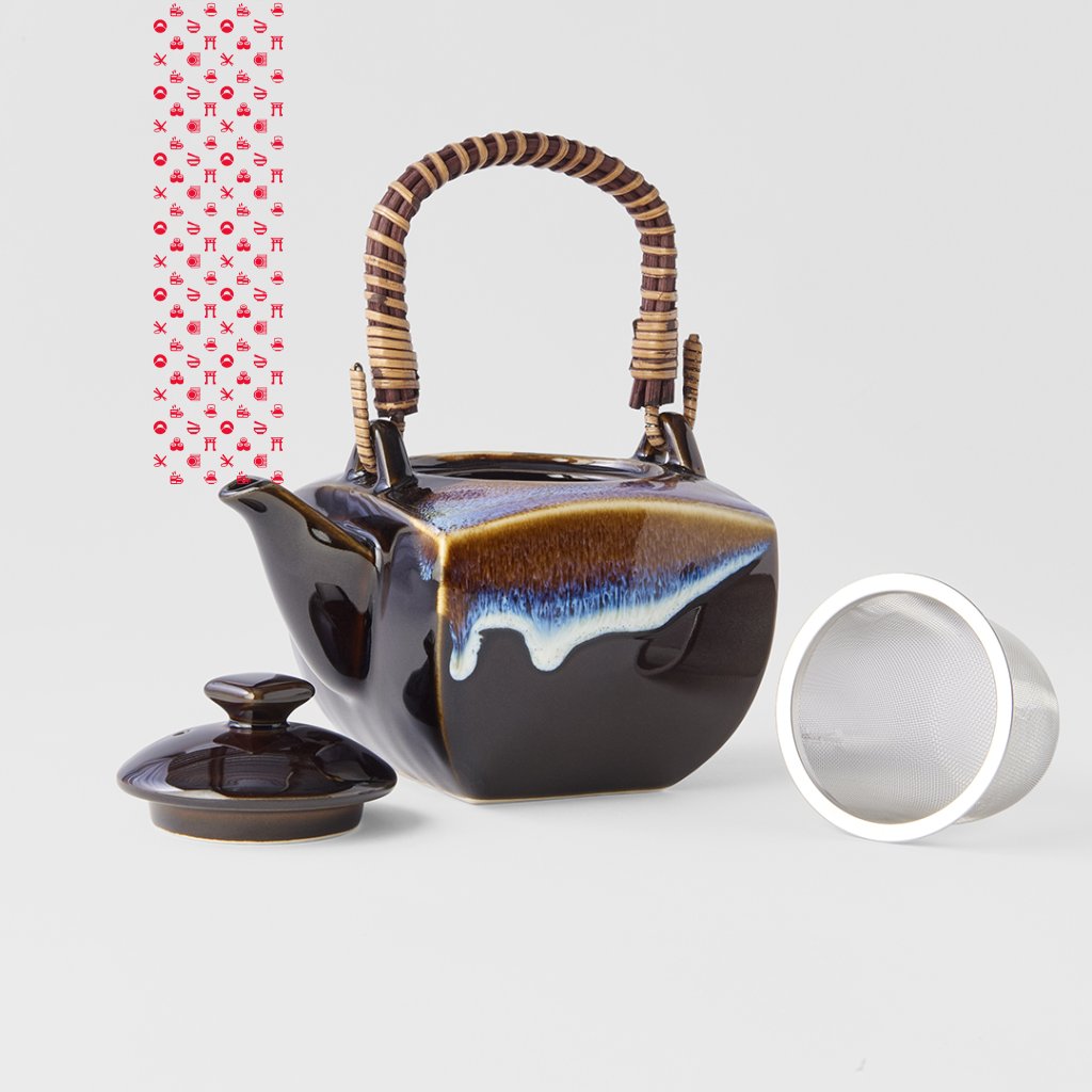 Čajový set Tenmokku s jasně modrou glazurou. Elegantní a unikátní design se promítá do celé sady, která obsahuje čajovou konvici, 4 šálky a sítko.