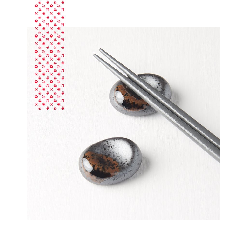 Oblázek v černé barvě spolu se stříbrným leskem a karamelovým odstínem je určen pro odkládání jídelních hůlek mezi jednotlivými chody.