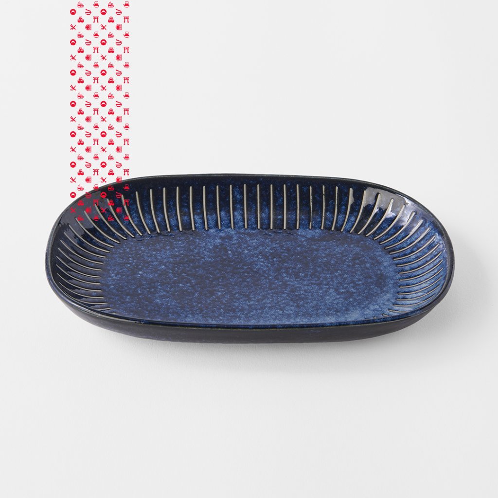 Oválný talíř s vysokým okrajem a rozměry 18,7 x 12,8 cm v indigově modré barvě z kolekce RIDGED INDIGO.