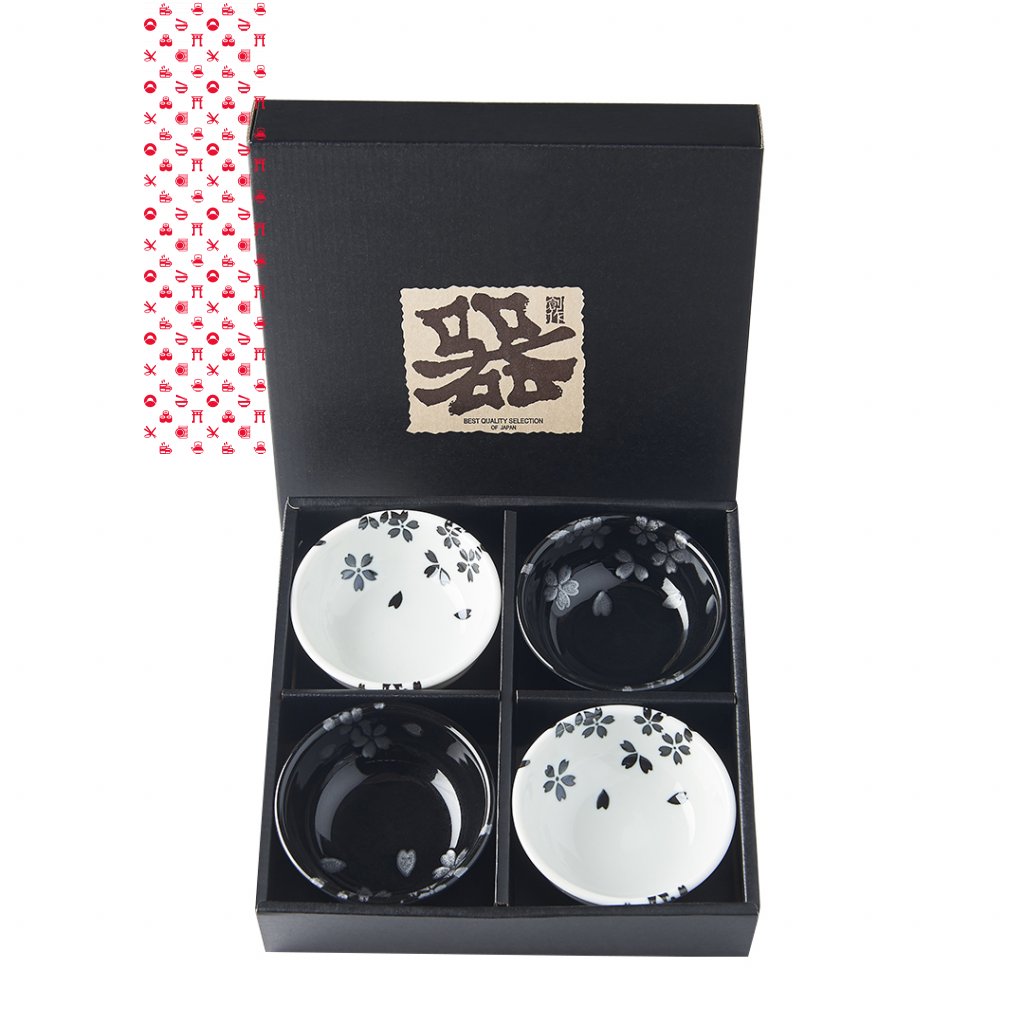 Set obsahuje 2 lesklé bílé misky s černými lístky japonské třešně Sakury a 2 lesklé černé misky se stříbrnými lístky Sakury. Lístky jsou ručně malovány. Tato sada je dodávána v elegantní černé dárkové krabičce, a je tedy vhodná jako dárek pro přátele nebo obchodní partnery.