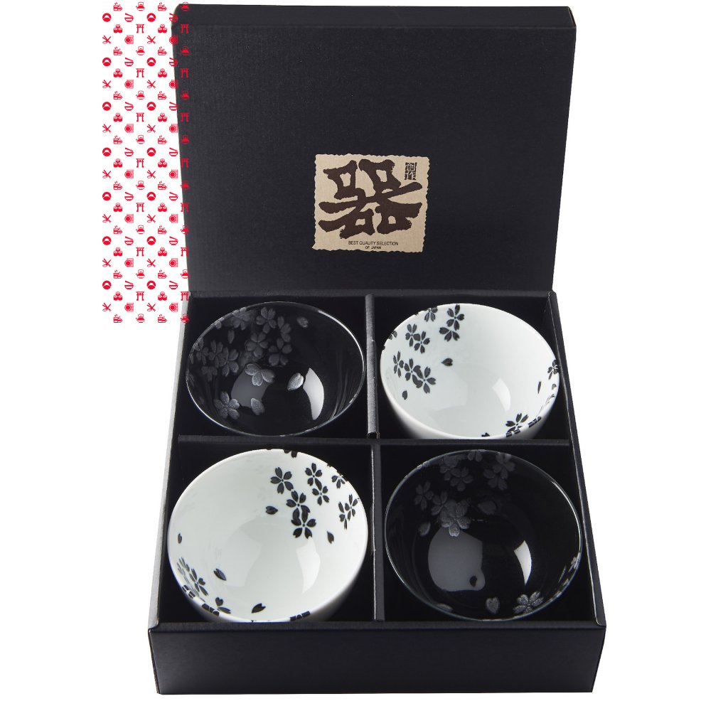 Set obsahuje 2 lesklé bílé misky s černými lístky japonské třešně Sakury a 2 lesklé černé misky se stříbrnými lístky Sakury. Lístky jsou ručně malovány. Tato sada je dodávána v elegantní černé dárkové krabičce, a je tedy vhodná jako dárek pro přátele nebo obchodní partnery.