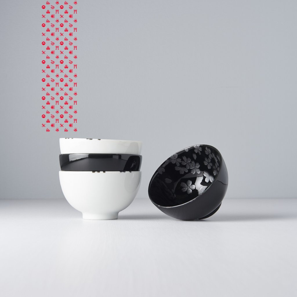 Set obsahuje 2 lesklé bílé misky s černými lístky japonské třešně Sakury a 2 lesklé černé misky se stříbrnými lístky Sakury. Lístky jsou ručně malovány. Tato sada je dodávána v elegantní černé dárkové krabičce, a je tedy vhodná jako dárek pro přátele nebo obchodní partnery.