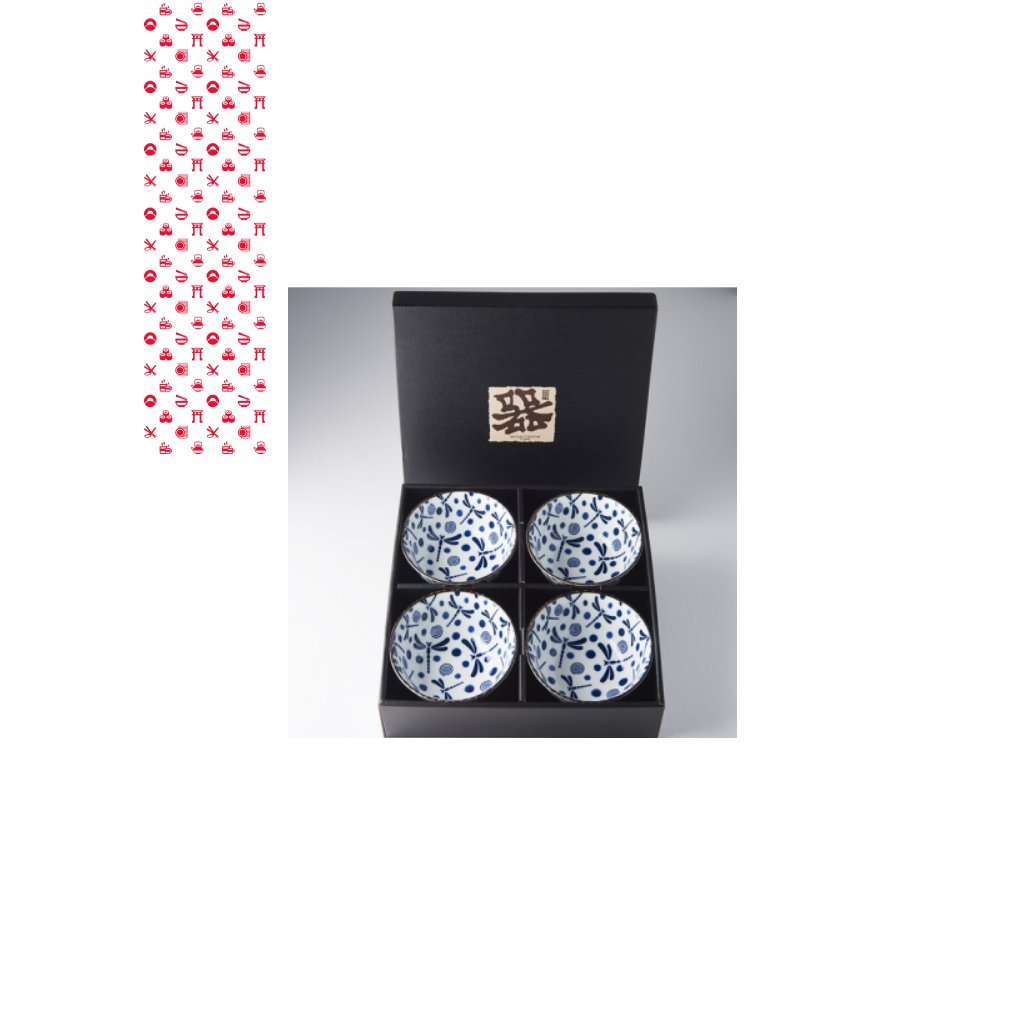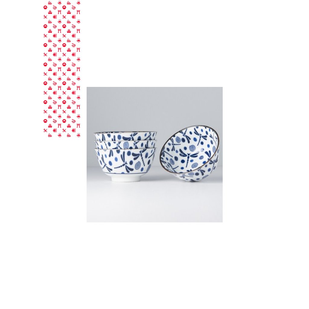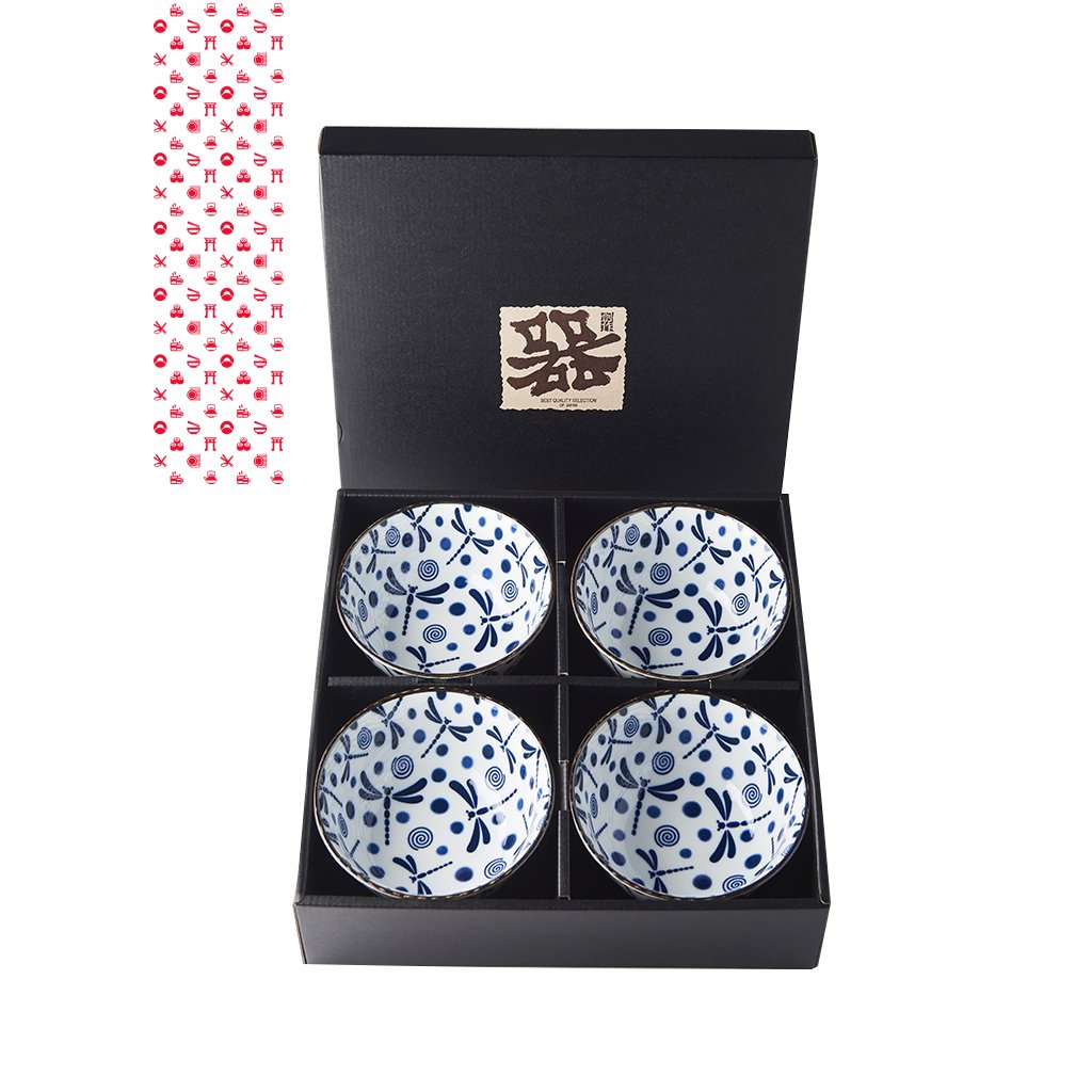 Set obsahuje 4 misky se vzorem modrých vážek na bílém podkladě. Okraj misek je ohraničený stříbrnou barvou. Tato sada je dodávána v elegantní černé dárkové krabičce, a je tedy vhodná jako dárek pro přátele nebo obchodní partnery.