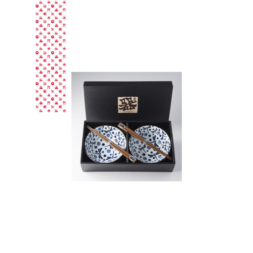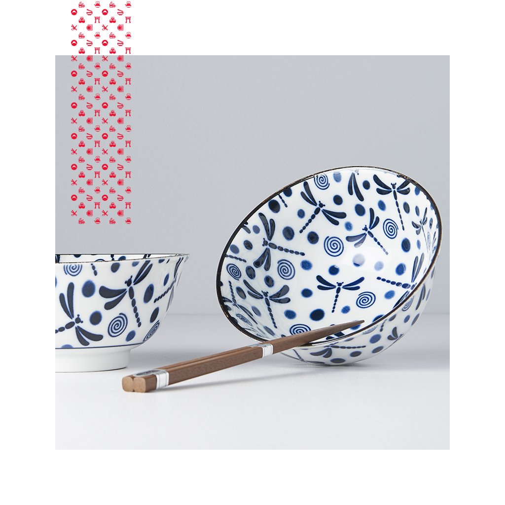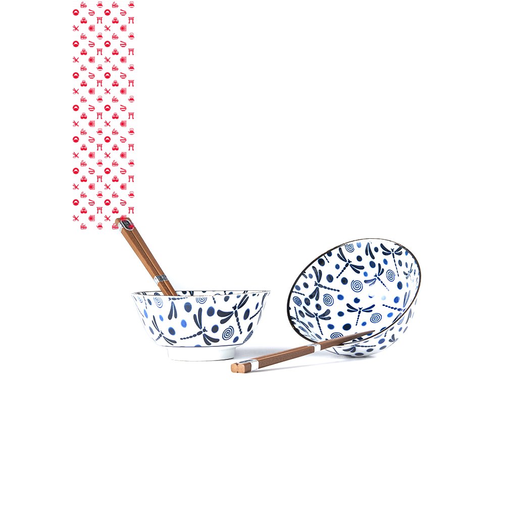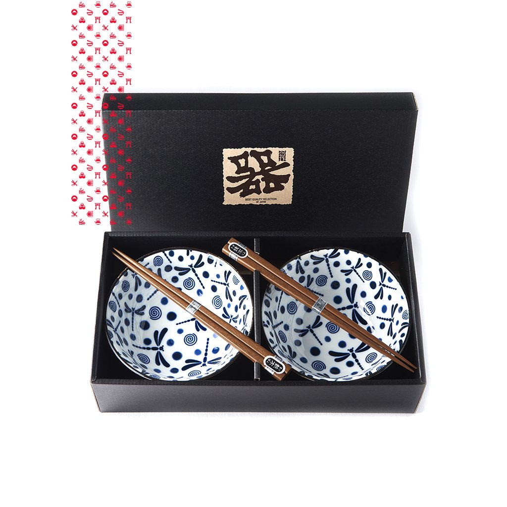 Set obsahuje 2 páry dřevěných jídelních hůlek a 2 misky se vzorem modrých vážek na bílém podkladě. Okraj misek je ohraničený stříbrnou barvou. Tato sada je dodávána v elegantní černé dárkové krabičce, a je tedy vhodná jako dárek pro přátele nebo obchodní partnery.