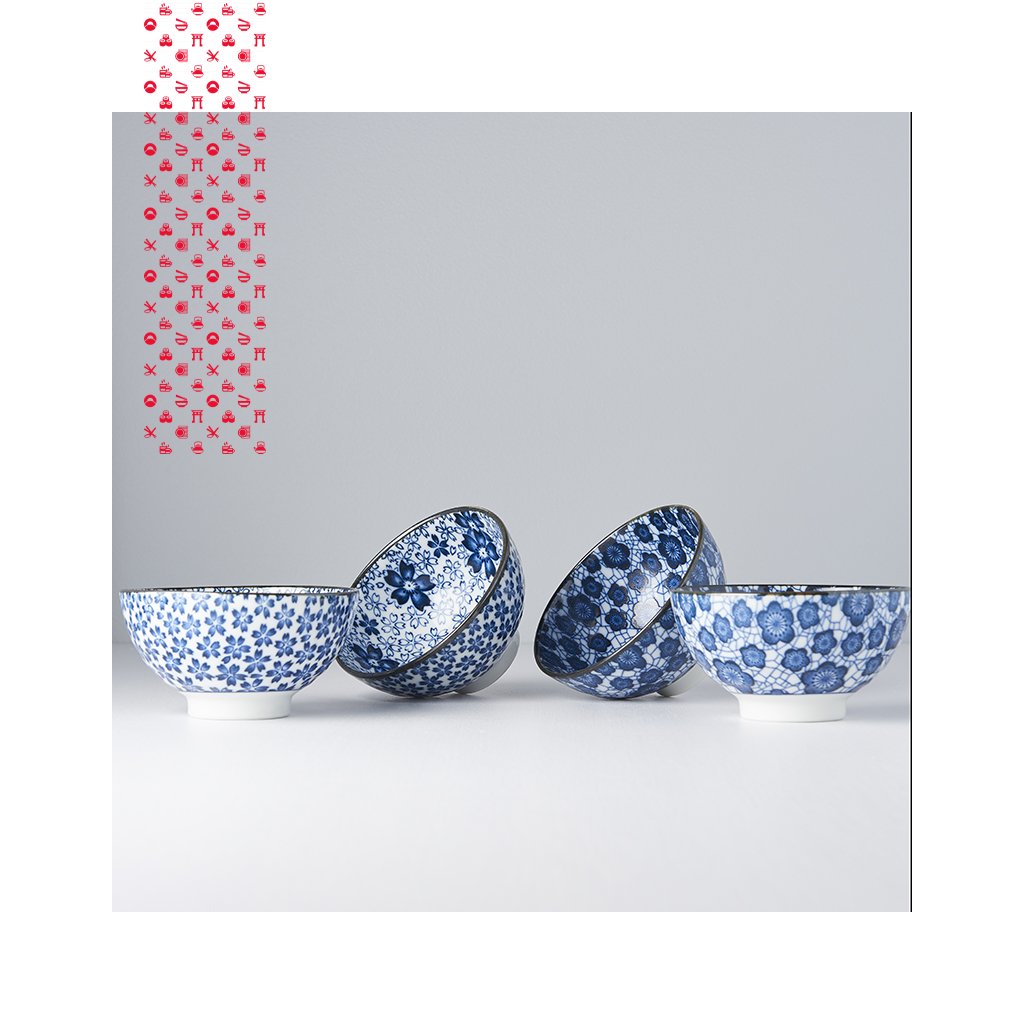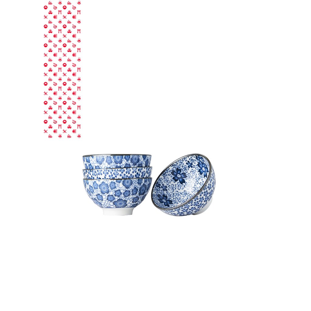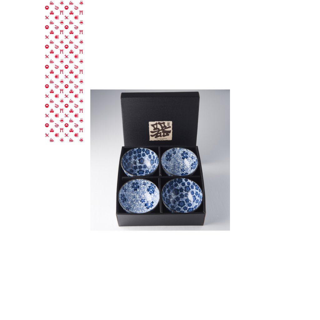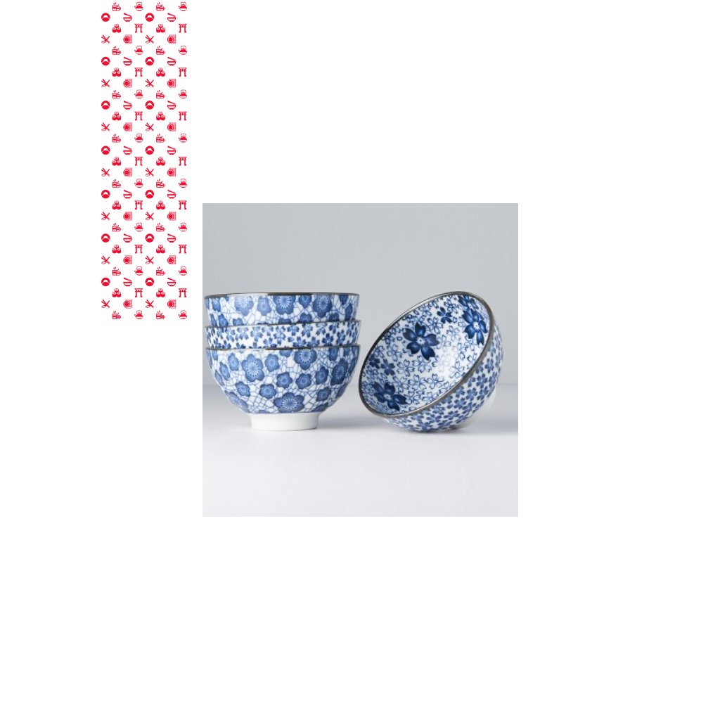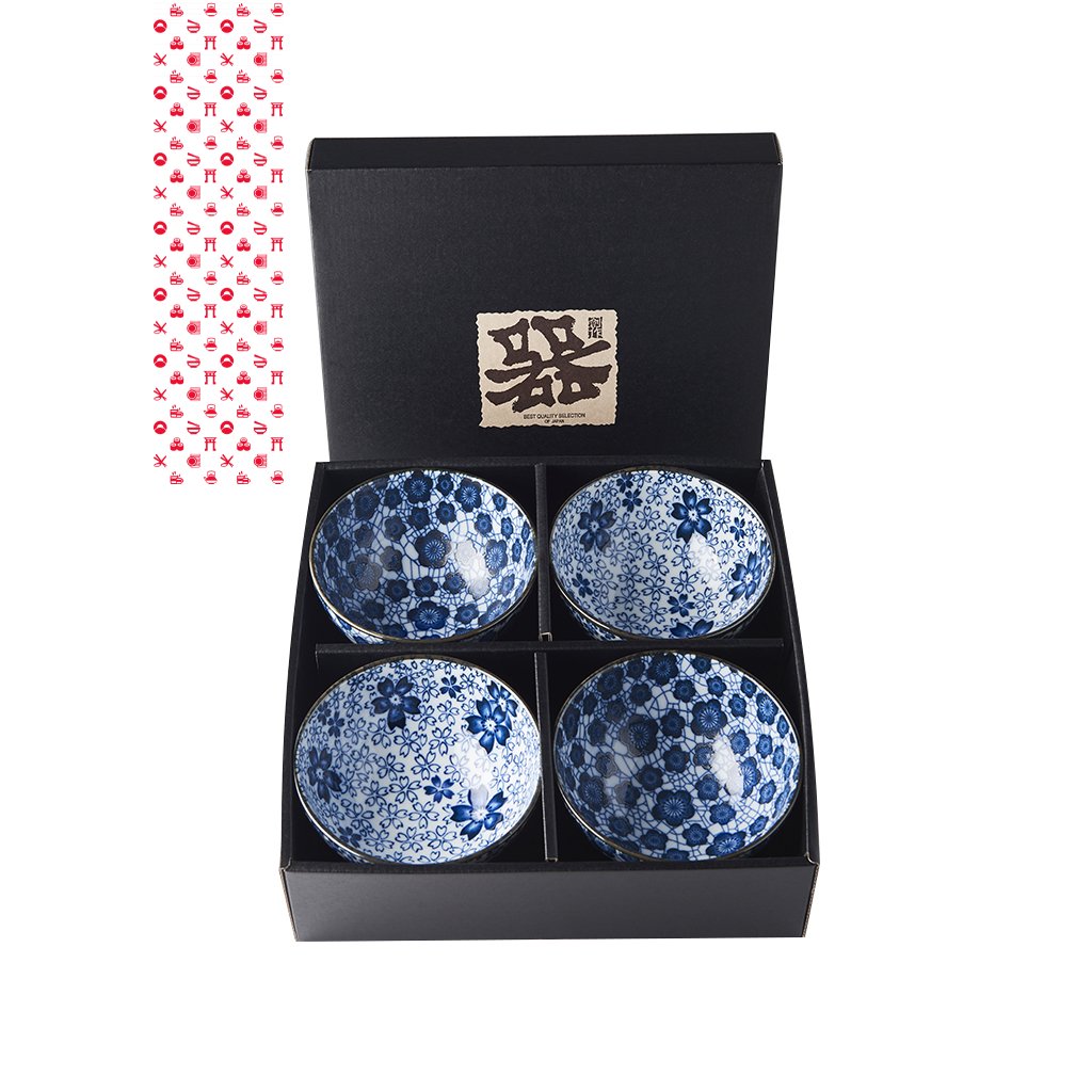 Set obsahuje 4 misky se vzorem modrých kvítků na bílém podkladě. Okraj misek je ohraničený stříbrnou barvou. Tato sada je dodávána v elegantní černé dárkové krabičce, a je tedy vhodná jako dárek pro přátele nebo obchodní partnery.