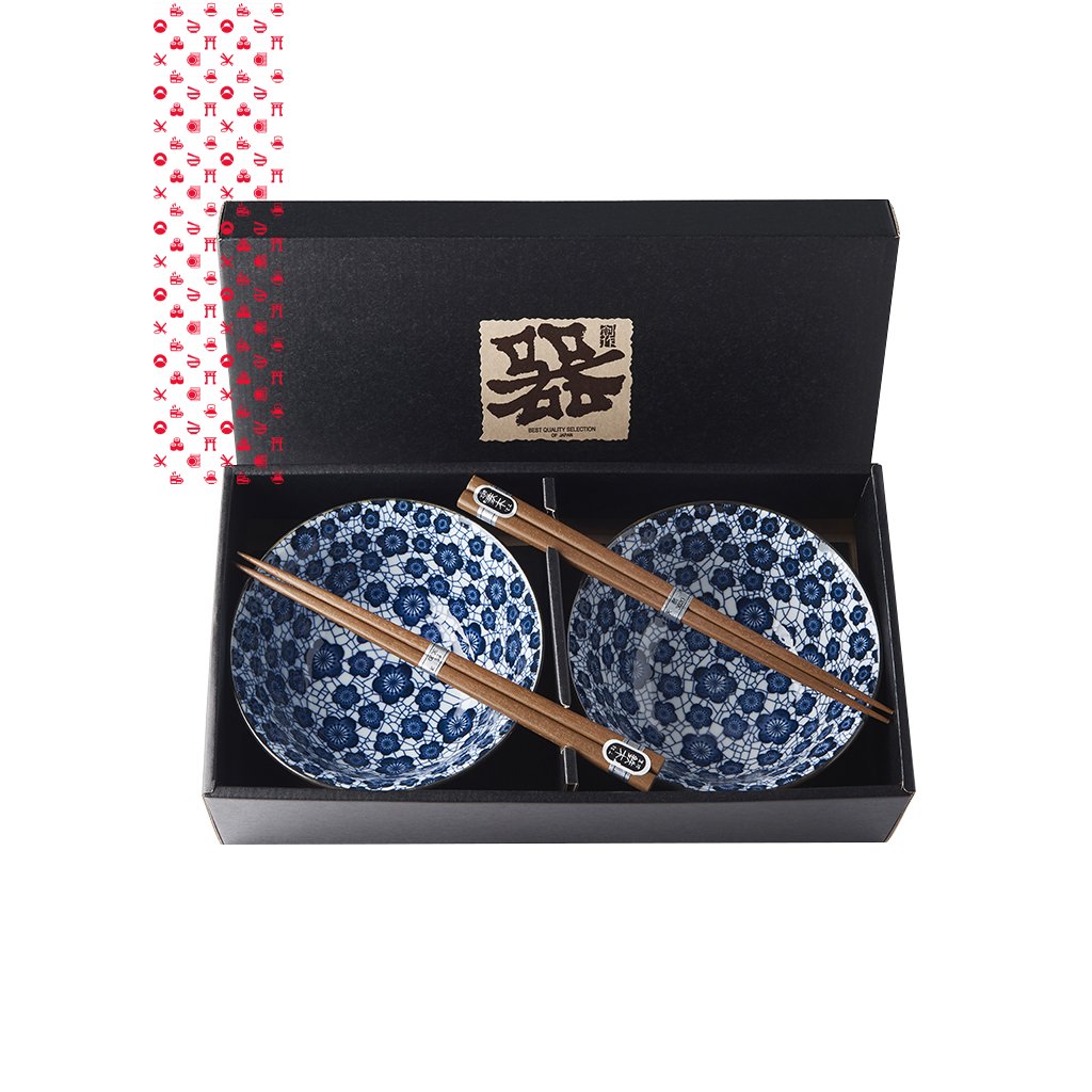 Set obsahuje 2 dřevěné jídelní hůlky a 2 misky se vzorem modrých vážek na bílém podkladě. Okraj misek je ohraničený stříbrnou barvou. Tato sada je dodávána v elegantní černé dárkové krabičce, a je tedy vhodná jako dárek pro přátele nebo obchodní partnery.