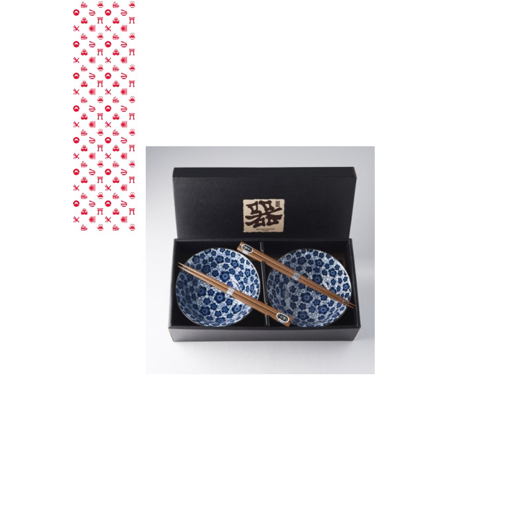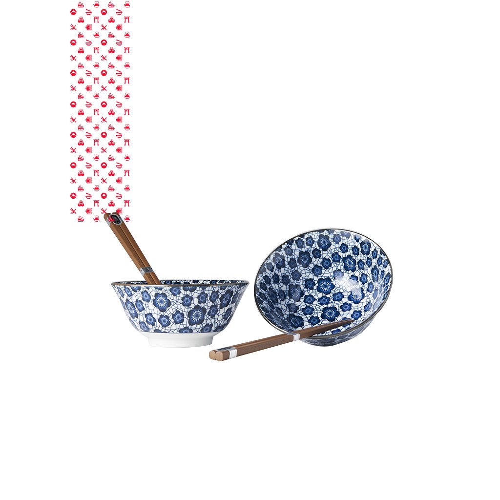 Set obsahuje 2 dřevěné jídelní hůlky a 2 misky se vzorem modrých vážek na bílém podkladě. Okraj misek je ohraničený stříbrnou barvou. Tato sada je dodávána v elegantní černé dárkové krabičce, a je tedy vhodná jako dárek pro přátele nebo obchodní partnery.