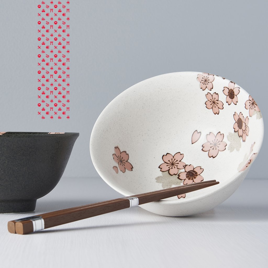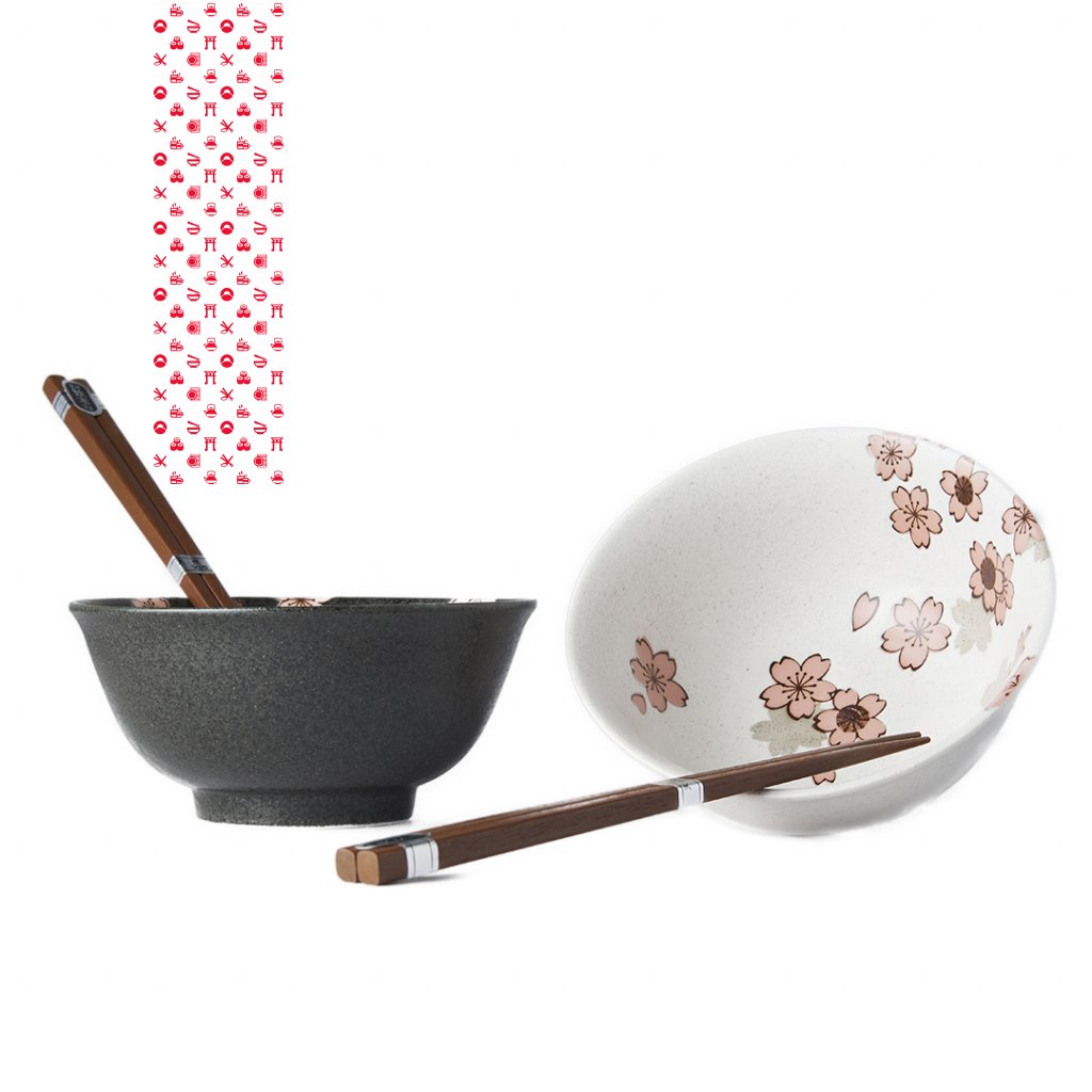 Set obsahuje 2 páry dřevěných jídelních hůlek, 1 misku v černé barvě s ručně malovanými kvítky sakury (japonská třešeň) a 1 bílou misku s šedými kvítky sakury. Tato sada je dodávána v elegantní černé dárkové krabičce, a je tedy vhodná jako dárek pro přátele nebo obchodní partnery.