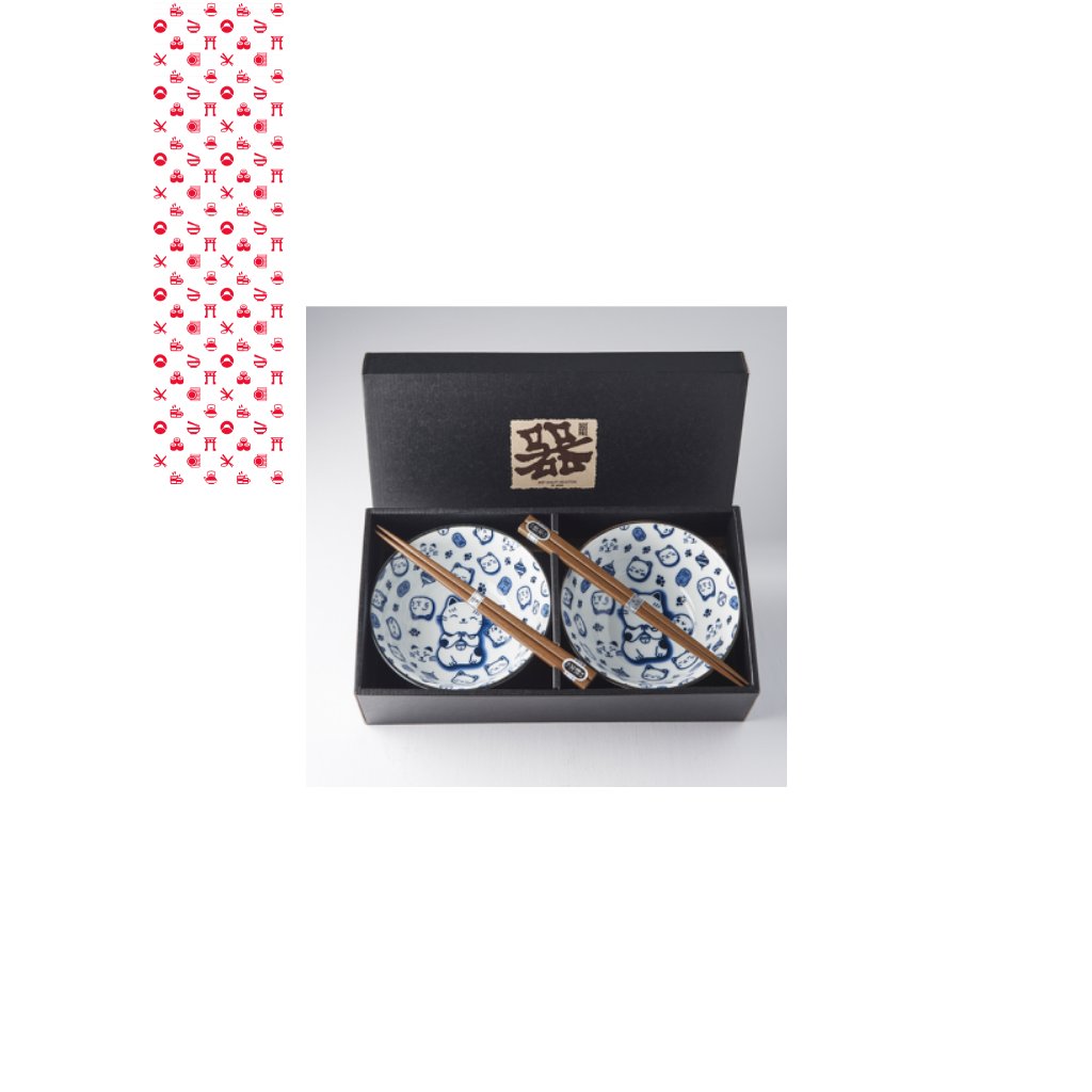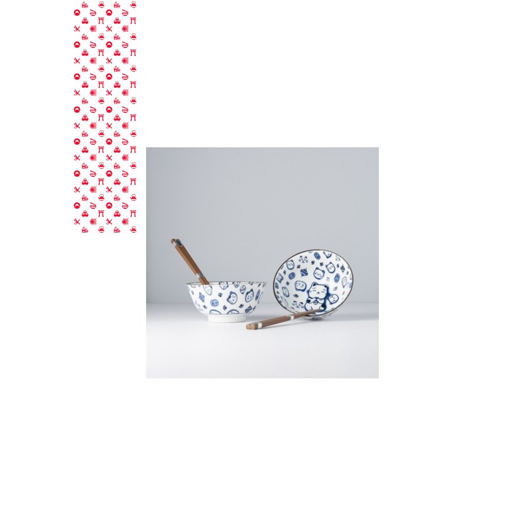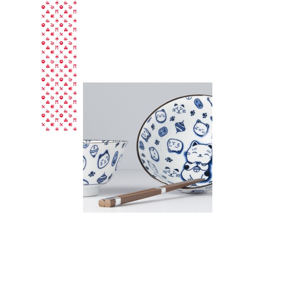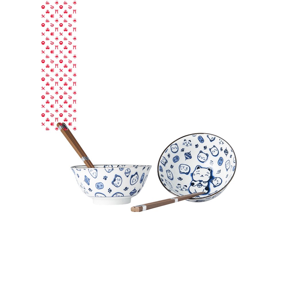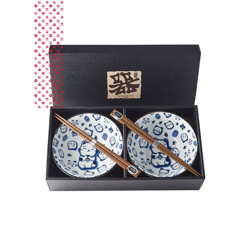 Set obsahuje 2 páry dřevených jídelních hůlek a 2 misky se vzorem modrých japonských koček na bílém podkladě. Okraj misek je ohraničený stříbrnou barvou. Tato sada je dodávána v elegantní černé dárkové krabičce, a je tedy vhodná jako dárek pro přátele nebo obchodní partnery.