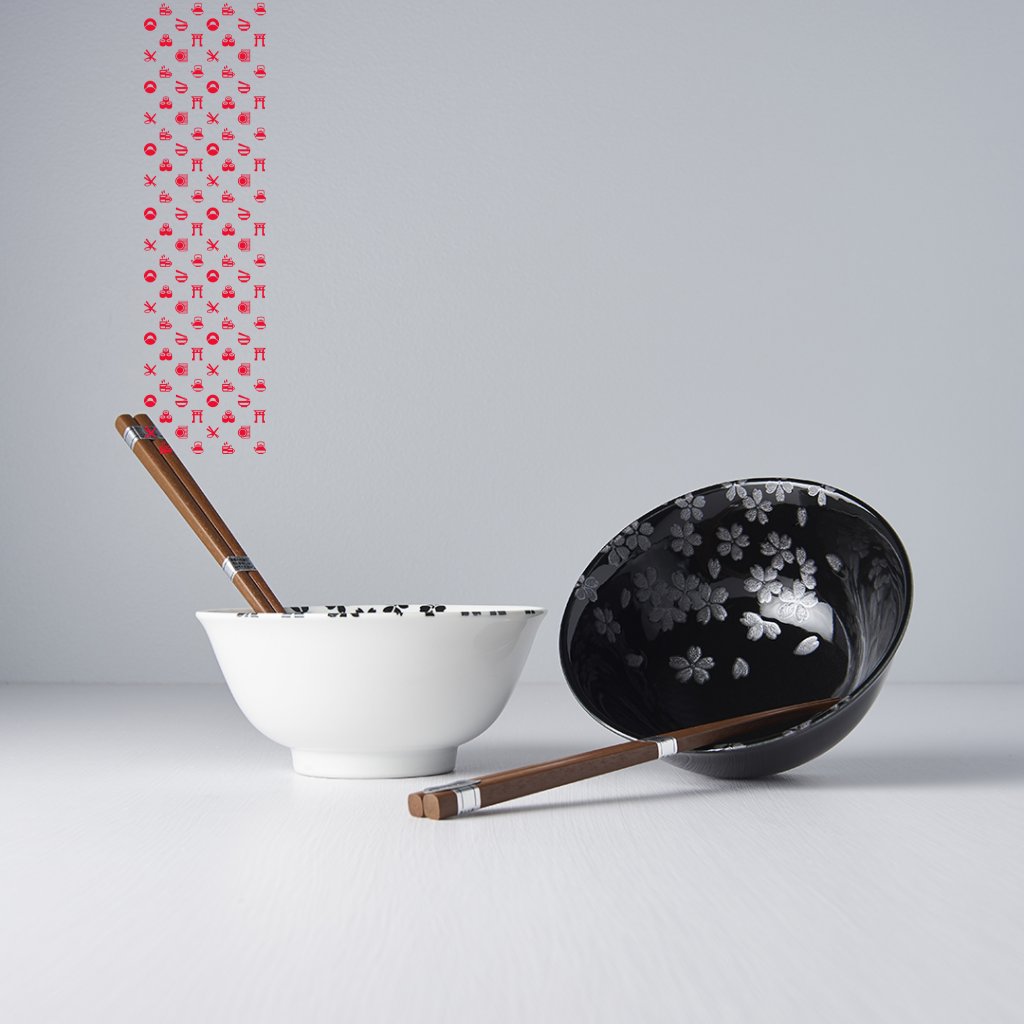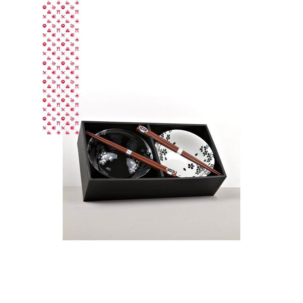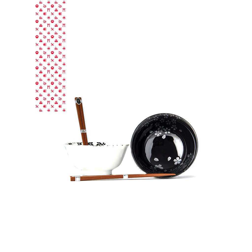 Set obsahuje 2 páry dřevěných jídelních hůlek a 2 misky v černé a bílé barvě s ručně malovanými šedými kvítky skury. Tato sada je dodávána v elegantní černé dárkové krabičce, a je tedy vhodná jako dárek pro přátele nebo obchodní partnery.