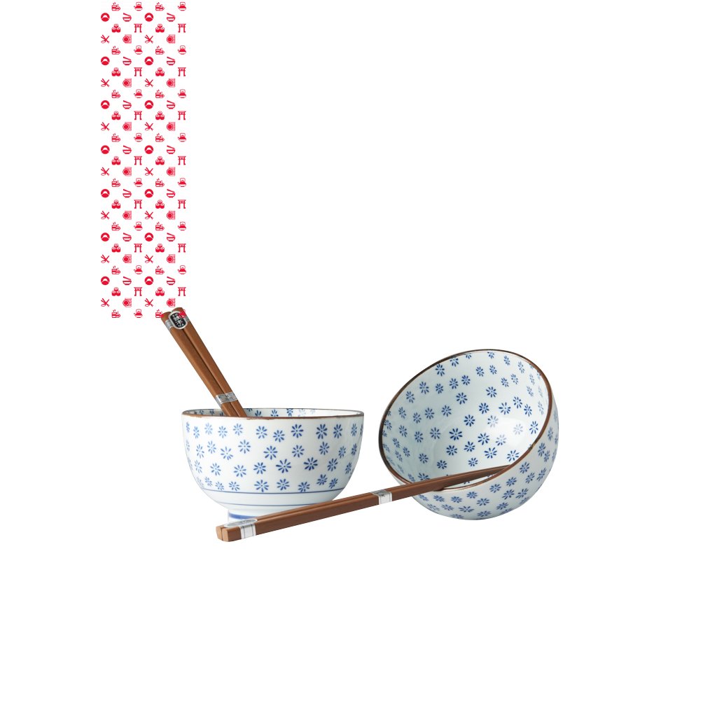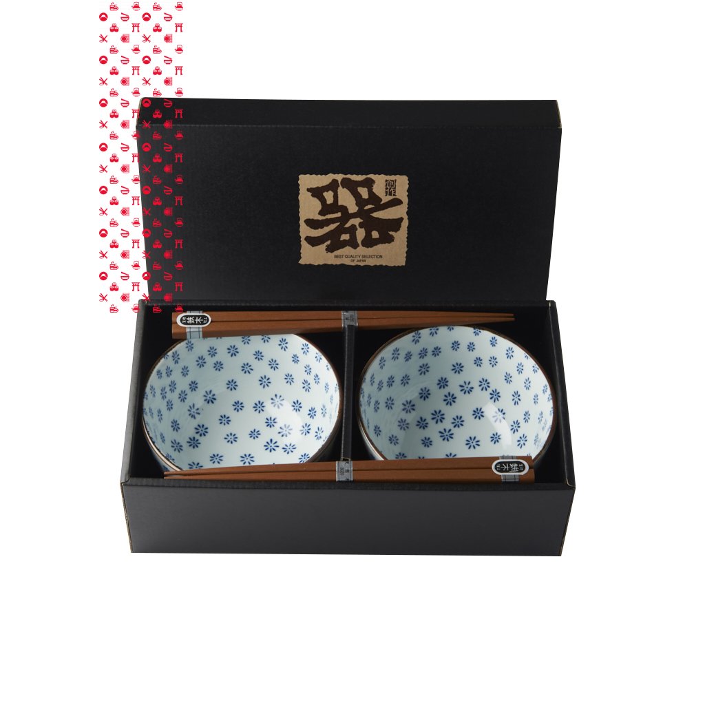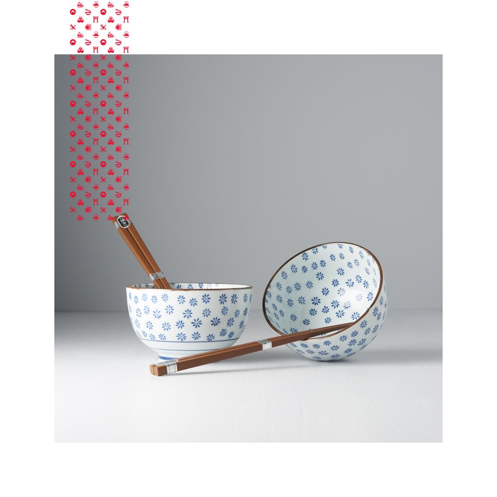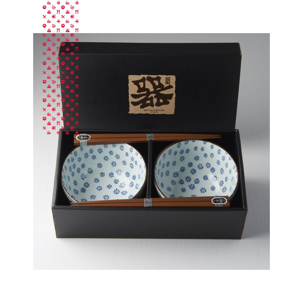 Set obsahuje 2 páry dřevěných jídelních hůlek a 2 misky v bílé barvě s motivem modrých vloček. Misky jsou ohraničené zlatou linkou. Tato sada je dodávána v elegantní černé dárkové krabičce, a je tedy vhodná jako dárek pro přátele nebo obchodní partnery.