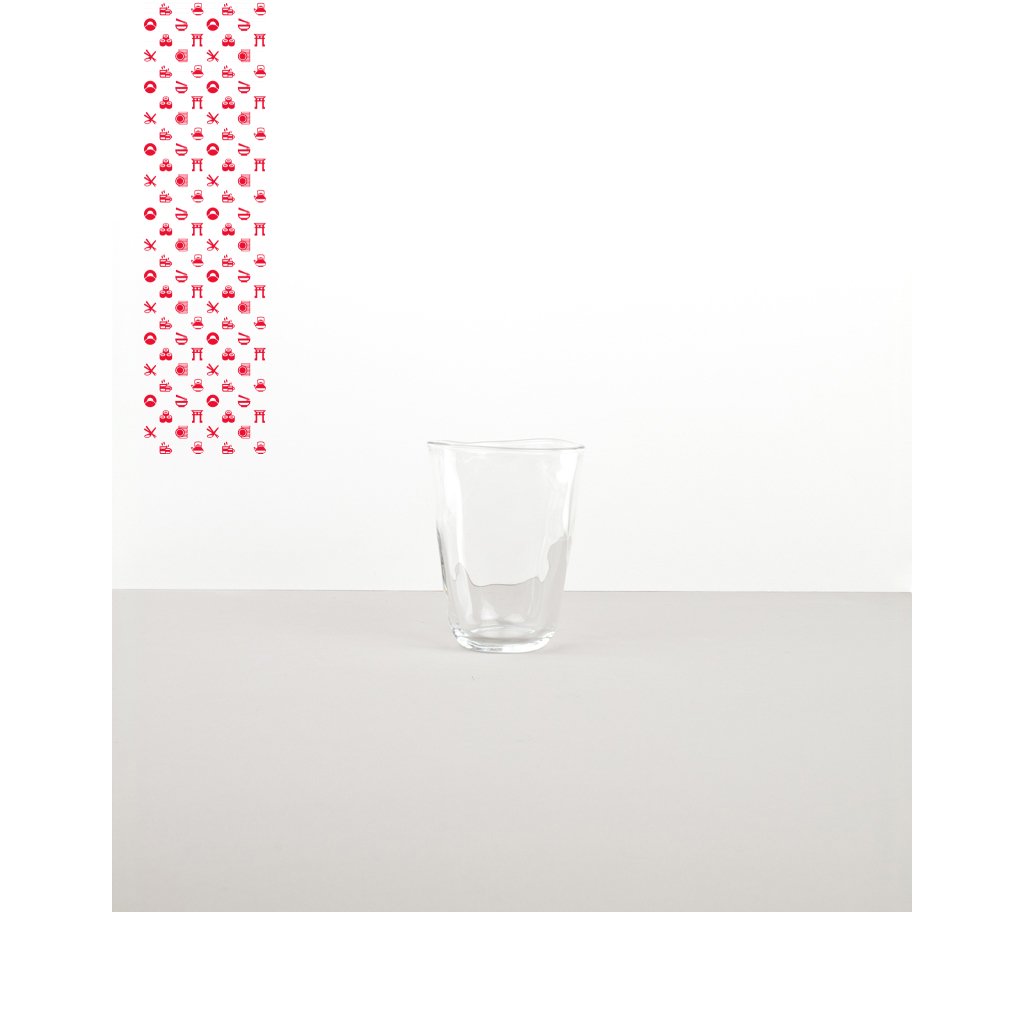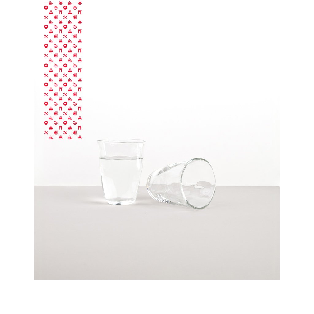 Sklenice má minimalistický vzhled a její nepravidelný okraj připomíná pohyb na vodní hladině.