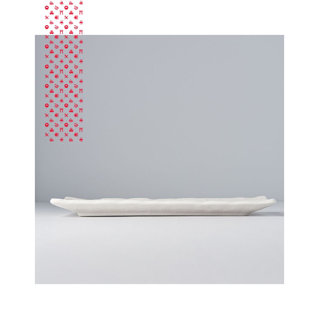 Talíř má obdélníkový tvar s nepravidelným okrajem. Má matný a drsný povrch. Talíř využijete pro servírování sushi a sashimi.