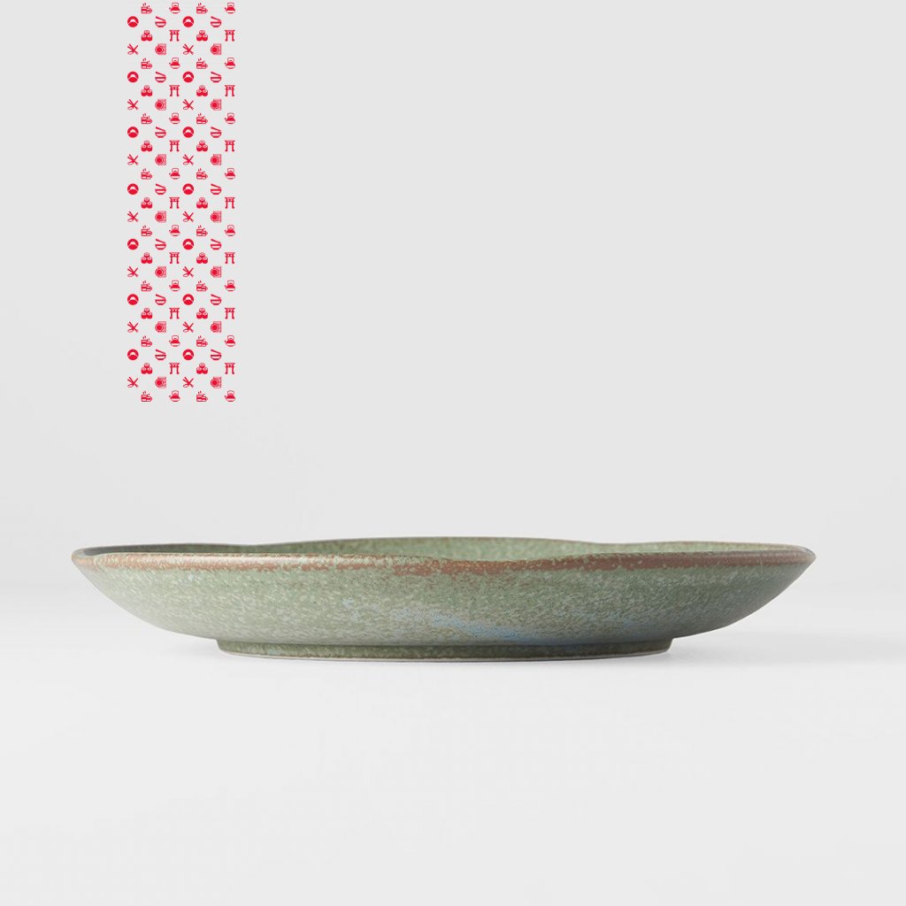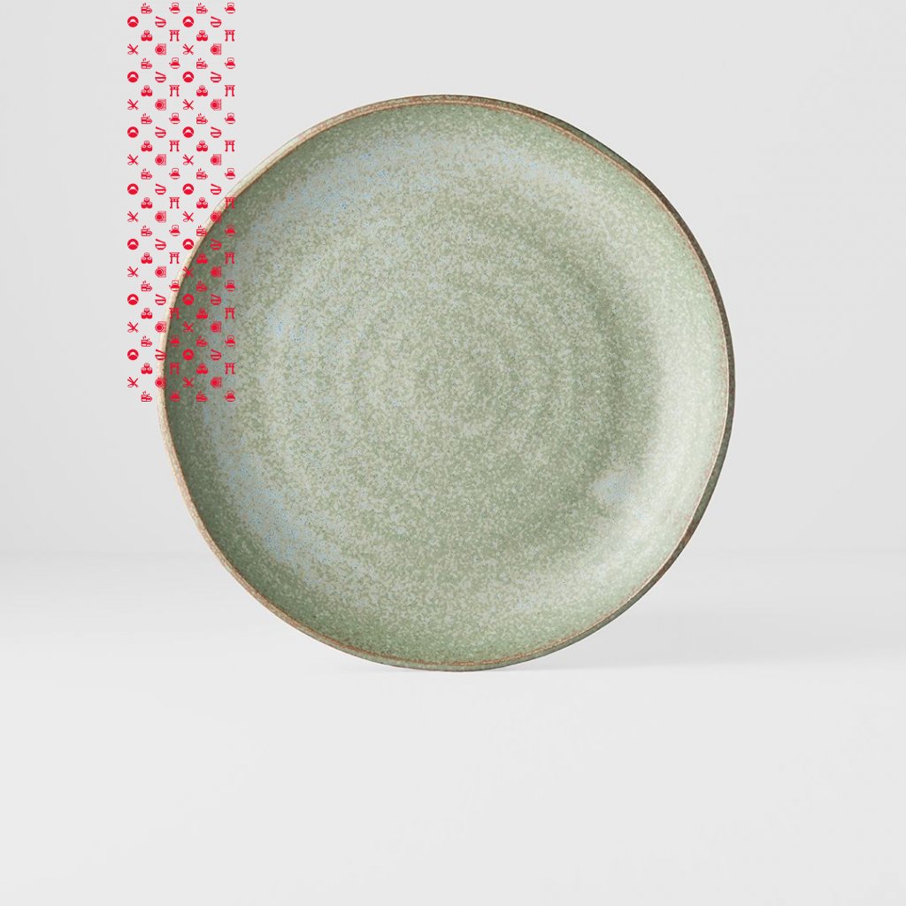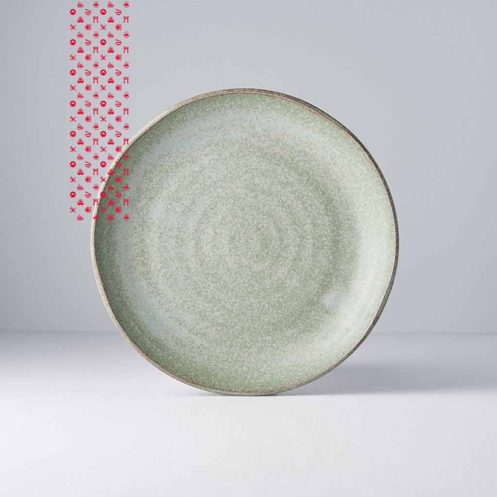 Nerovnoměrný talíř s 24 cm průměrem z kolekce Fade v zelené barvě je vyroben ručně z odolné keramiky a je vhodná do myčky nádobí i do mikrovlnné trouby. Keramika je dovezena přímo z Japonska.